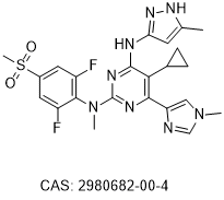 5-cyclopropyl-N2-(2,6-difluoro-4-(methylsulfonyl)phenyl)-N2-methyl-6-(1-methyl-1H-imidazol-4-yl)-N4-(5-methyl-1H-pyrazol-3-yl)pyrimidine-2,4-diamine |