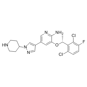 Crizotinib (PF-02341066, PF-2341066) is a potent, selective, orally bioavailable, ATP-competitive inhibitor of c-Met catalytic activity with Ki of 4 nM.